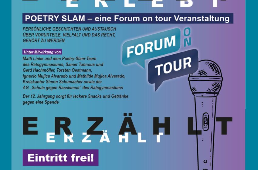 „Erlebt, erzählt, verändert – Poetry Slam, persönliche Geschichten und Austausch über Vorurteile, Vielfalt und das Recht, gehört zu werden“ lautet die Forum on tour Veranstaltung der Jugendlichen ...