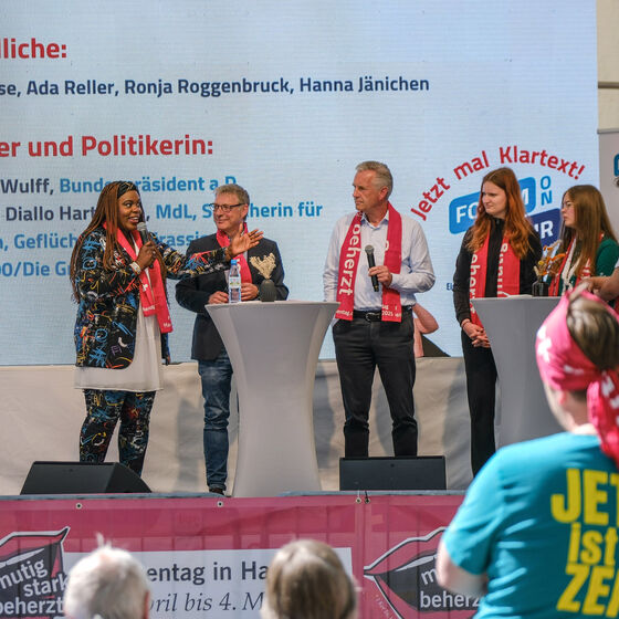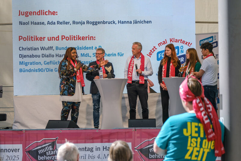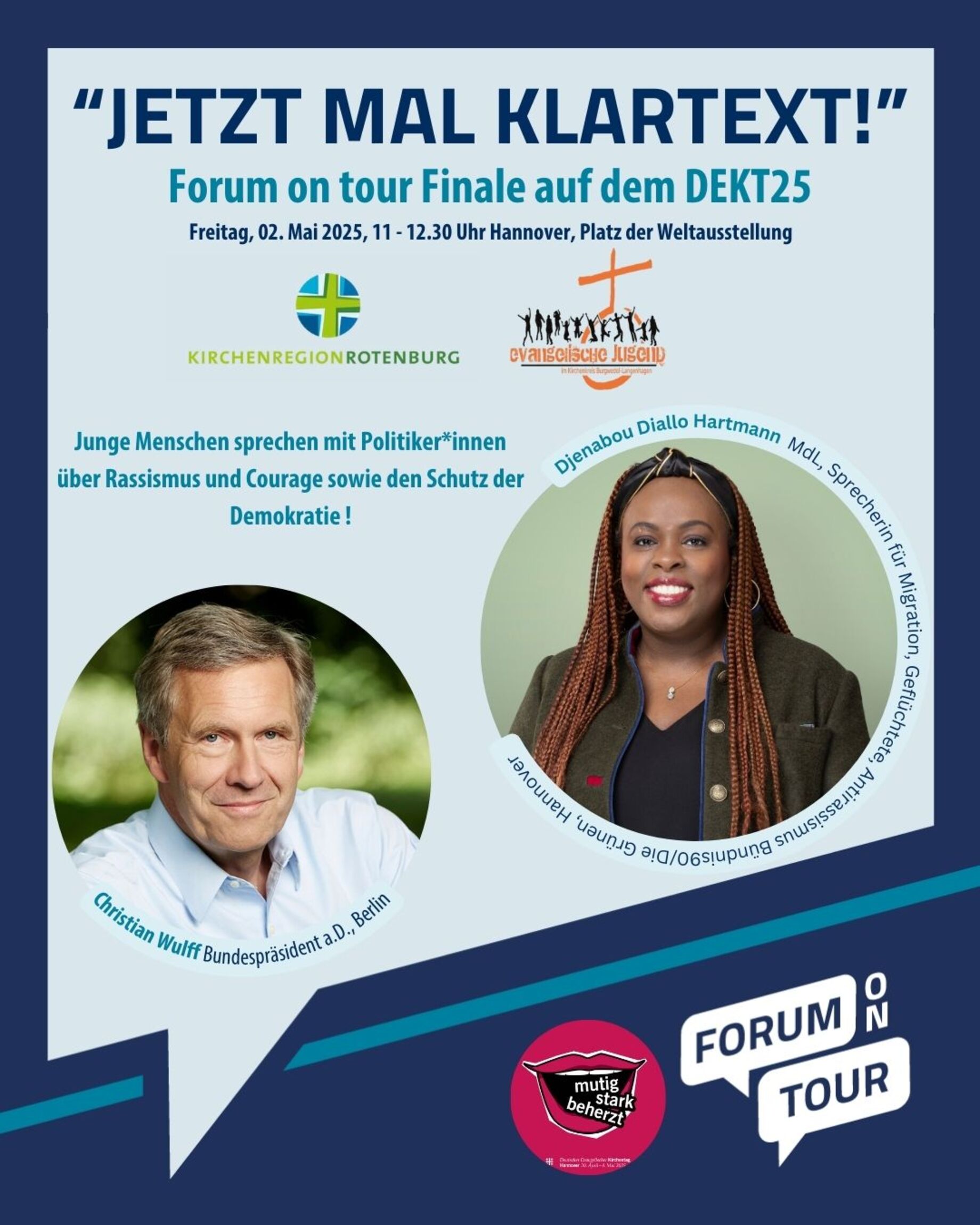 Als besonderes Highlight treten die beteiligten Jugendlichen in den Dialog mit der niedersächsischen Landtagsabgeordneten und Sprecherin für Migration, Geflüchtete und Antirassismus der Fraktion Bündnis 90/Die Grünen, Djenabou Diallo Hartmann, und dem Bundespräsident a .D. Christian Wulff. Mit ihrem Engagement in Antirassismus, Bildung und Politik ermutigen sie junge Menschen, sich aktiv für eine offene Gesellschaft einzusetzen. Am Freitagvormittag werden sie sich den Fragen der Jugendlichen stellen, die vor allem eins wollen: Klartext! Mehr dazu: Kirchentag | Programm | Suche |